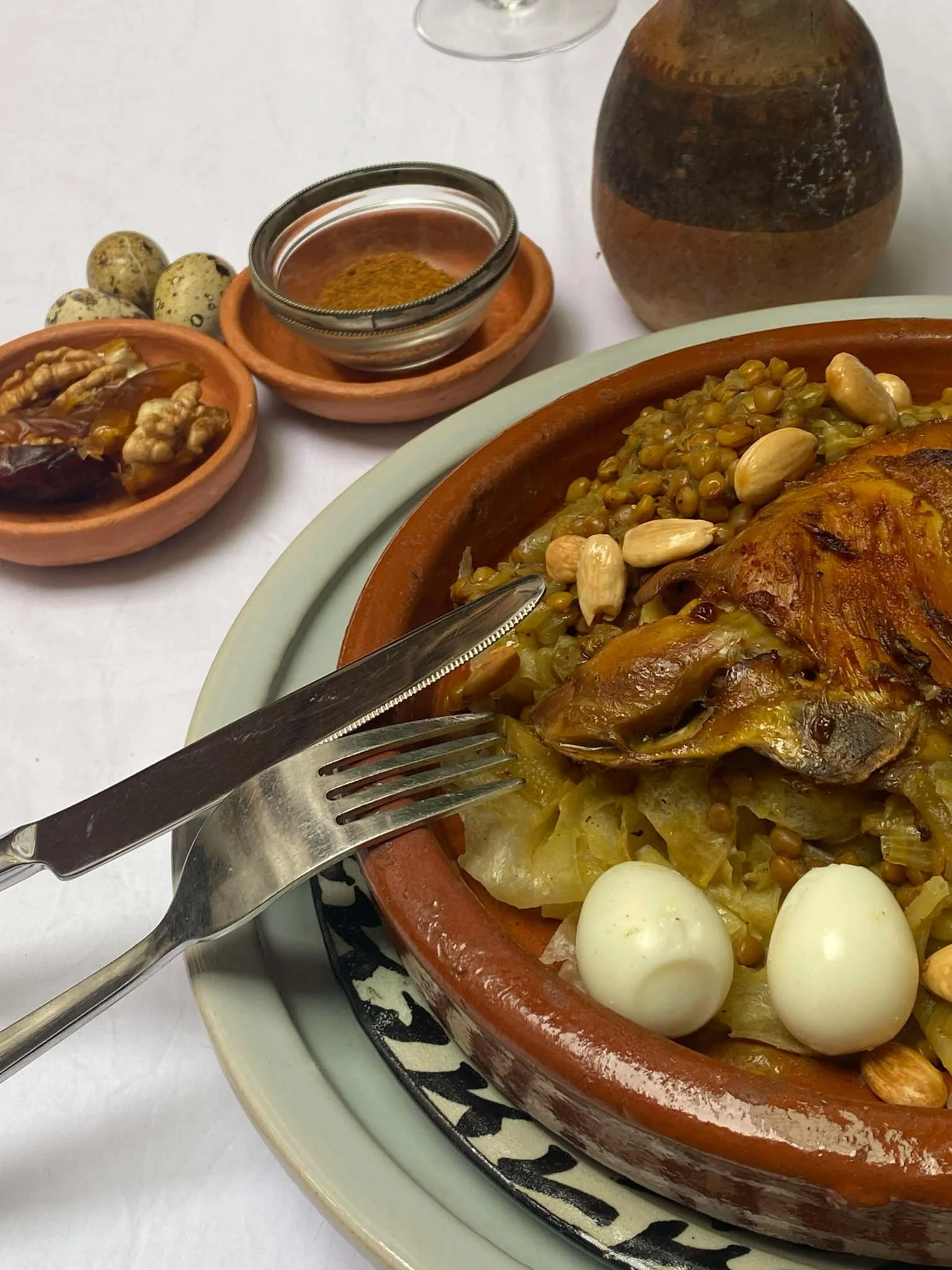 Viande d'agneau et fruits secs mijotés, épices et huile d'olives